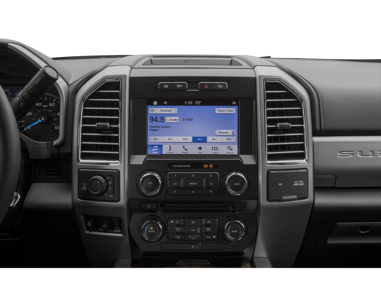 LARIAT ULTIMATE PACKAGE Power Heated/Cooled Driver Seat w/Memory, PowerScope Trailer Tow Mirrors w/Memory, Automatic High Beam, rain-sensing windshield wipers, EASY ENTRY®/Exit Memory Drivers Seat Feature, Tailgate Step & Handle, LED Box Lighting, LED Center High-Mounted Stop Lamp (CHMSL), Intelligent Access w/Push-Button Start, Power Heated/Cooled Passenger Seat, Voice-Activated Navigation, HD and SiriusXM Traffic and Travel Link, NOTE: SiriusXM Traffic and Travel Link includes a, Services are not available in Alaska and Hawaii, Memory Power-Adjustable Pedals, Remote Start System, Ambient Lighting - Fixed Color, Power Telescoping/Tilt Steering Wheel/Column, heat, memory and audio controls, Remote Tailgate Release, CHROME PACKAGE 2 front chrome tow hooks, Unique Chrome Mirror Caps, Wheels: 18 Chrome PVD Aluminum, Body-Color Door Handles w/Chrome Insert, 6 Angular Chrome Step Bars, Chrome Exhaust Tip, BLIND SPOT INFORMATION SYSTEM (BLIS) cross-traffic alert and trailer tow (BLIS sensor in taillamp), ELECTRONIC-LOCKING W/3.73 AXLE RATIO, ENGINE: 6.2L 2-VALVE SOHC EFI NA V8 FLEX-FUEL Flex-Fuel badge on fleet orders only (STD). Ford LARIAT with Oxford White exterior and Black interior features a 8 Cylinder Engine with 385 HP at 5750 RPM*.