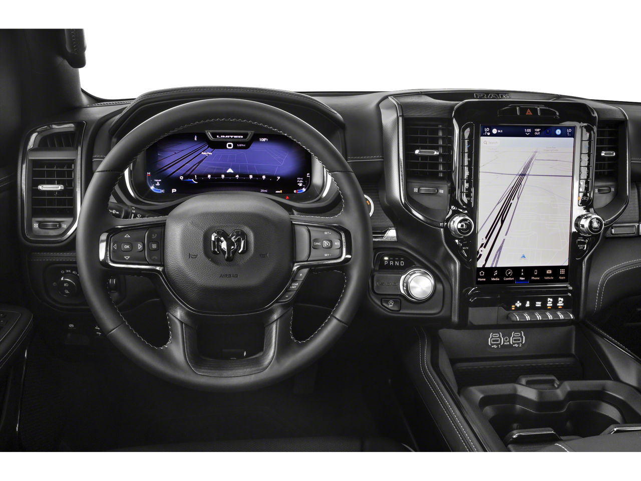 WHEELS: 22 X 9 POLISH/PAINTED W/INSERTS Tires: 285/45R22XL BSW All Season, ANTI-SPIN DIFFERENTIAL REAR AXLE, TRANSMISSION: 8-SPEED AUTOMATIC (8HP75) (STD), ENGINE: 5.7L V8 HEMI MDS VVT ETORQUE Delete Alternator, 18 Aluminum Spare Wheel (STD). Ram Limited with Patriot Blue Pearlcoat exterior and Black interior features a 8 Cylinder Engine with 395 HP at 5600 RPM*.